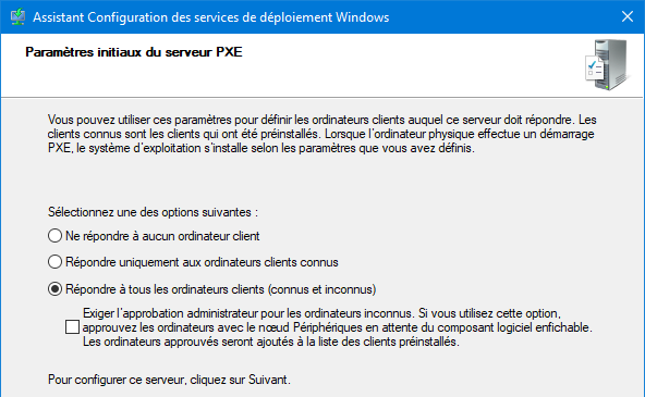 J’installe le rôle WDS et je le configure pour qu’il soit autonome (c’est-à-dire indépendant de l’Active Directory), que le serveur PXE réponde à tous les ordinateurs clients, et pour qu’ils démarrent automatiquement en PXE.