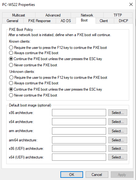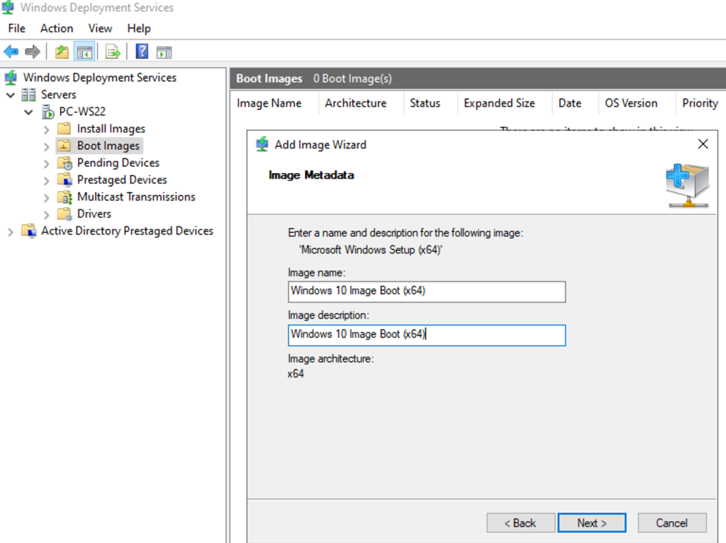 Je récupère l’image de démarrage boot.wim d’un fichier ISO Windows 10 et je l’intègre dans WDS. Cette image va servir à lancer le setup d’installation de Windows (Windows PE) sur la machine cible.