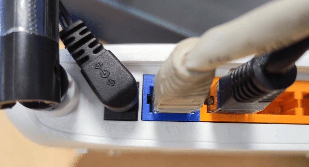 Ensuite, je branche le câble Ethernet provenant de l’arrivée Internet dans le port WAN (bleu), puis je connecte un second câble Ethernet du port LAN (orange) au PC.