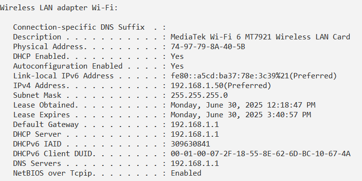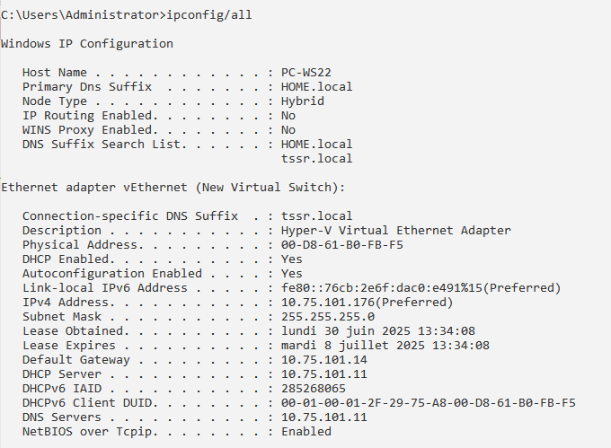 Une fois la réservation créée et activée, je lance la commande ipconfig /renew sur le PC afin de renouveler son adresse IP auprès du serveur DHCP.
