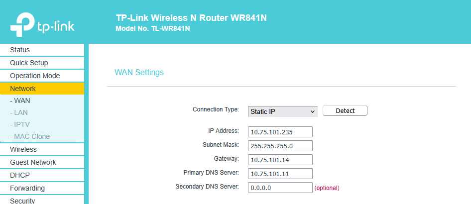Je choisis de définir l’adresse IP du réseau WAN sur 10.75.101.235 et de la fixer de manière statique.