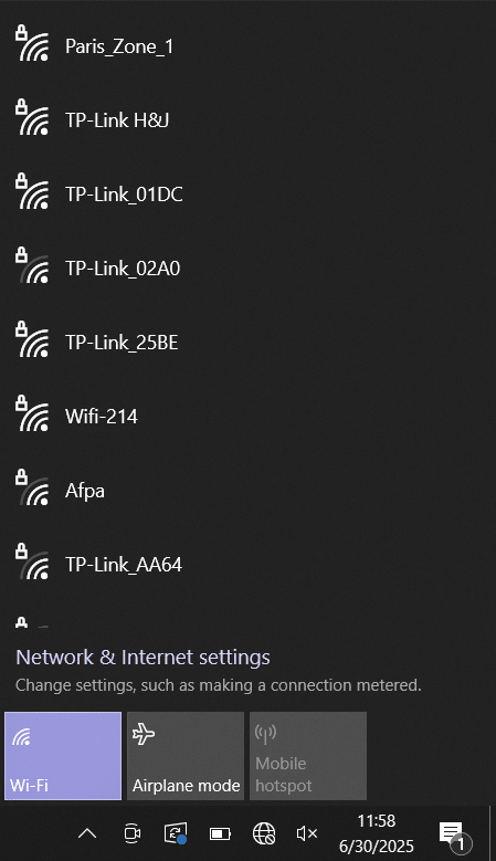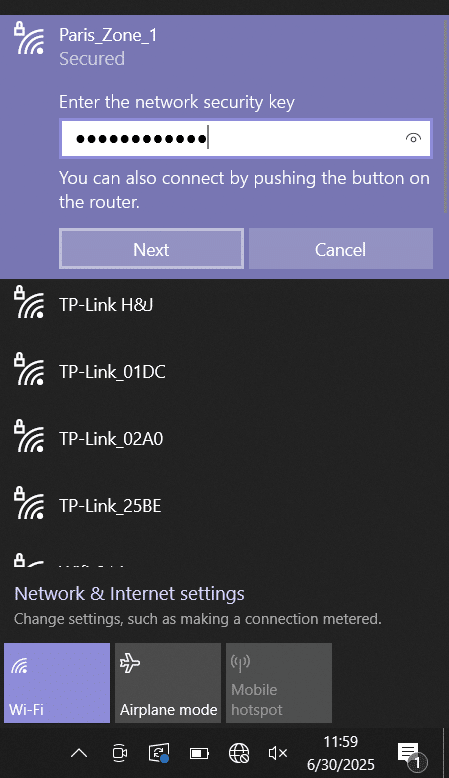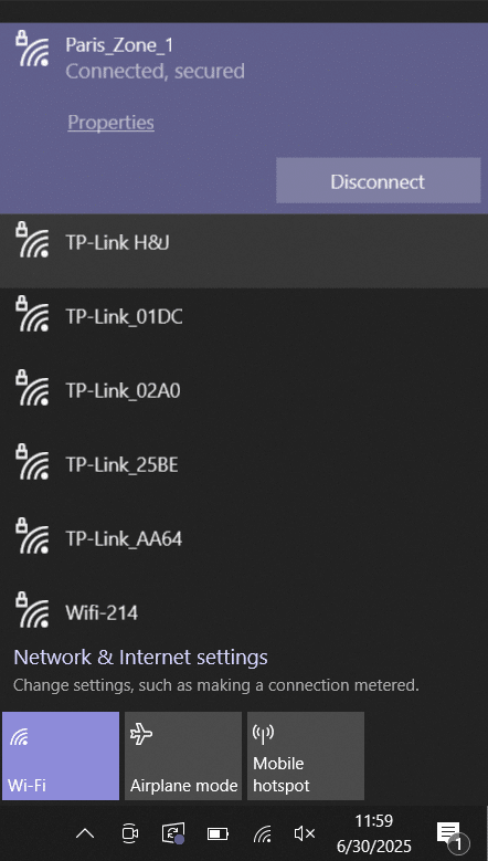 Sur mon PC portable ThinkPad, j’active la fonction Wi-Fi, je sélectionne le point d’accès nommé « Paris_Zone_1 » et saisis la clé de sécurité.