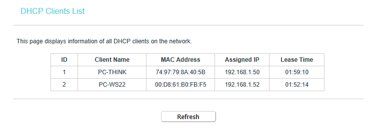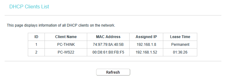 Dans l’interface web du routeur, le PC (nommé PC-THINK) apparaît bien dans la liste des clients DHCP.