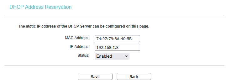 Je décide alors de modifier son adresse IP et de lui attribuer une adresse réservée : 192.168.1.8.